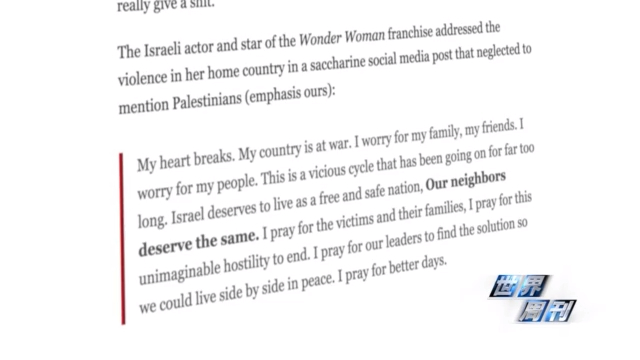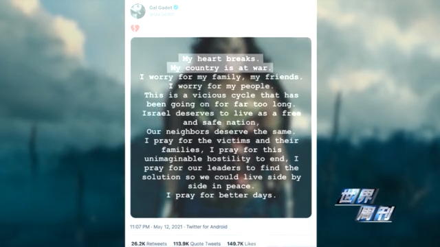 5月12日,DC宇宙中《神奇女侠》的扮演者以色列演员盖尔·加朵发推特说:“我的心碎了,以色列正陷入战争……以色列值得活在一个自由及安全的国家,我们的邻居们也一样。”