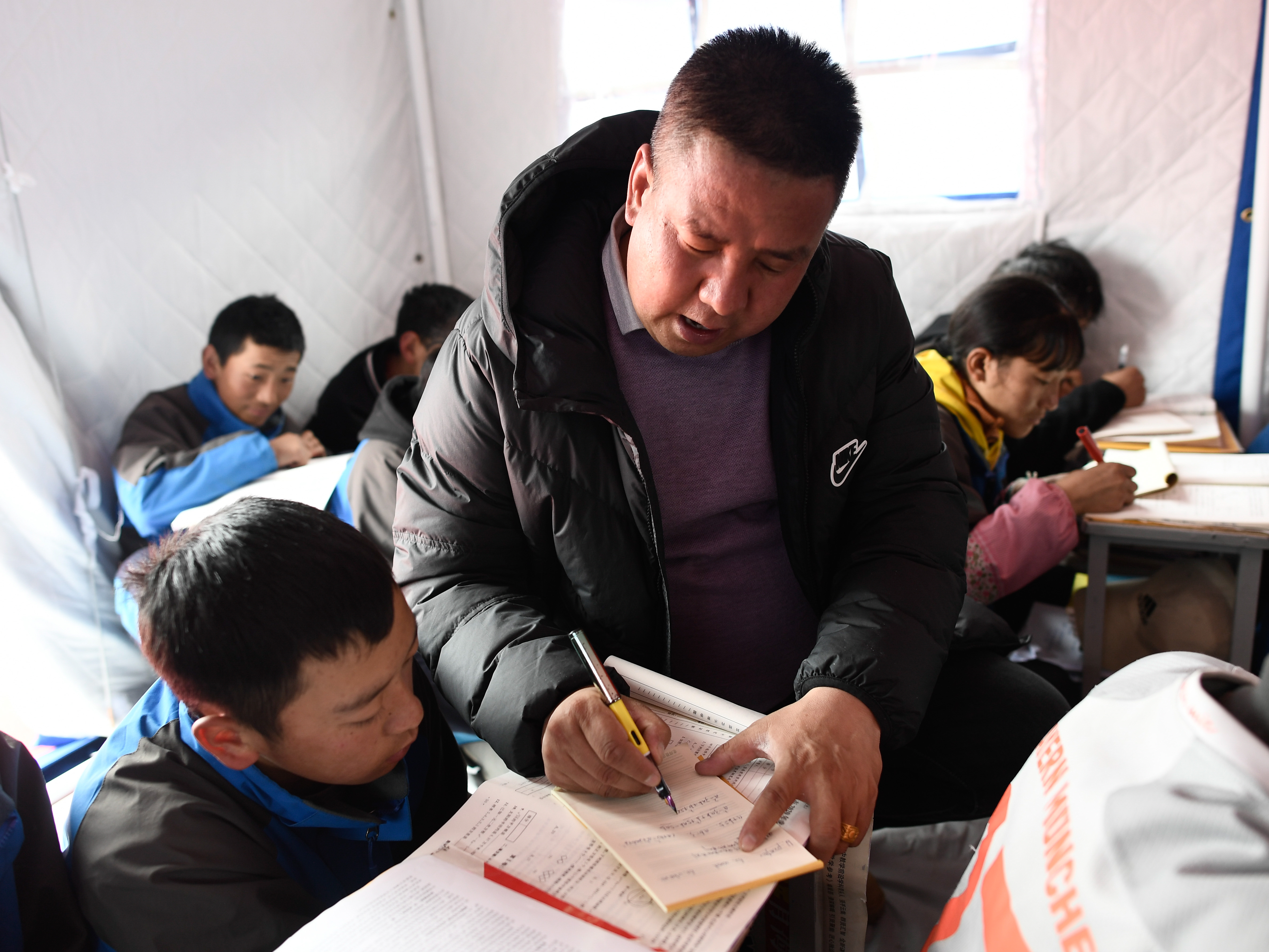 5月23日,青海省果洛藏族自治州玛多县民族寄宿制中学老师李加才让在帐篷教室给学生辅导功课。(新华社记者 张龙 摄)