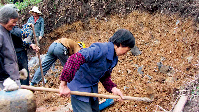 2006年2月,蓝凤秀带着8位年过六旬的村民开始“移山”。没钱请挖掘机、推土机,大家就用简单农耕工具,用自己的双手一点一点地挖;开山修路需要爆破,蓝凤秀便去学习爆破。
