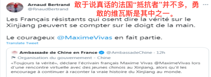 有网友转发中国驻法国大使馆推文并评论说:敢于说真话的法国“抵抗者”并不多,勇敢的维瓦斯是其中之一。