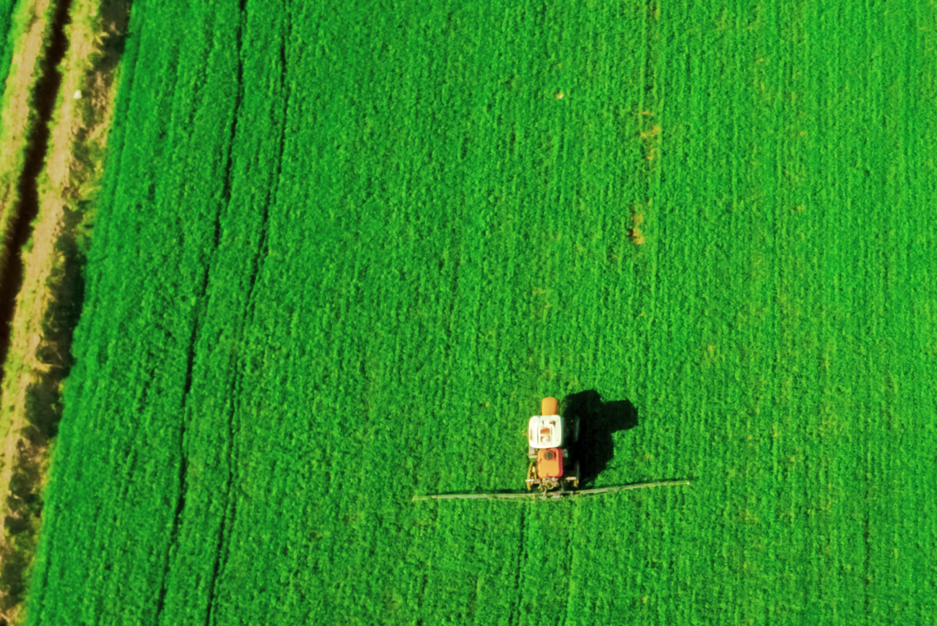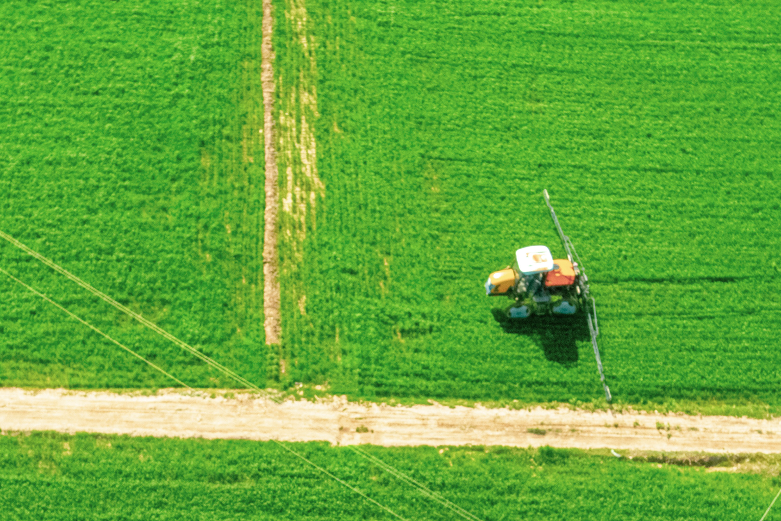 5月23日,内蒙古巴彦淖尔市临河区小麦集中连片种植基地正在喷洒农药(无人机拍摄)。新华社记者李云平摄