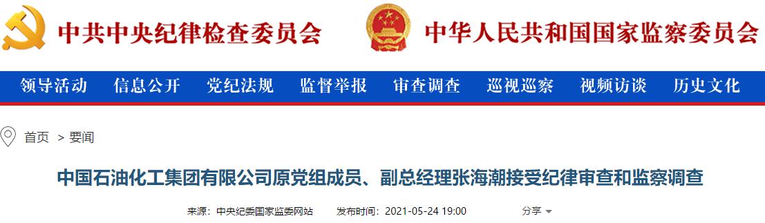 据中央纪委国家监委驻国资委纪检监察组、浙江省纪委监委消息:中国石油化工集团有限公司原党组成员、副总经理张海潮涉嫌严重违纪违法,目前正接受中央纪委国家监委驻国资委纪检监察组纪律审查;经国家监委、浙江省监委指定管辖,金华市监委对其监察调查。