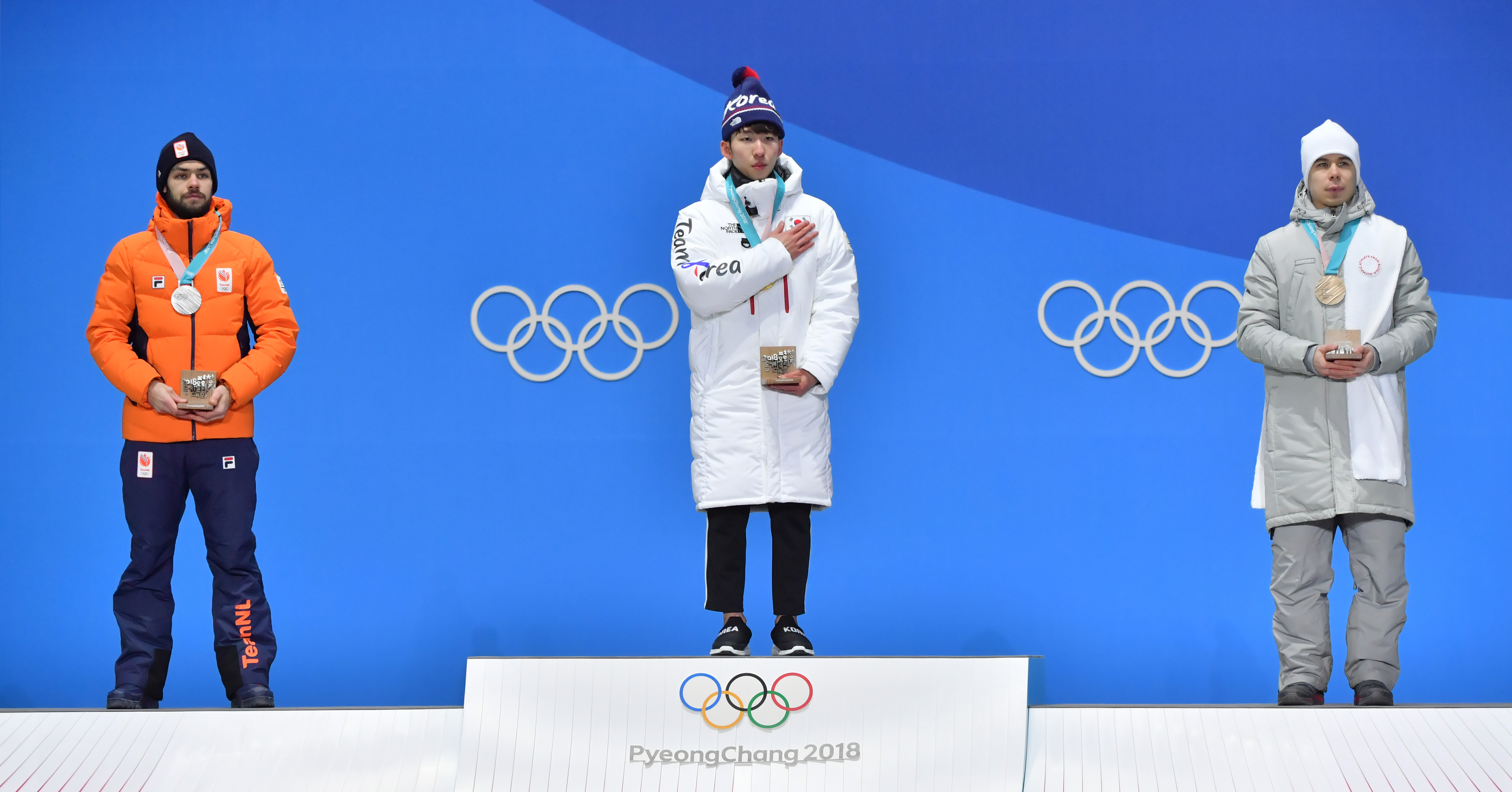 2018年2月11日,平昌冬奥会男子1500米颁奖仪式,获得冠军的韩国选手林孝俊(中)、获得亚军的荷兰选手克奈格特(左)与季军、来自俄罗斯的奥林匹克选手叶利斯特拉托夫合影。新华社记者吕小炜摄