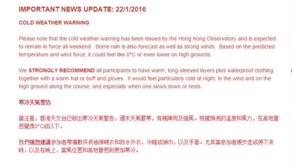 2016年1月23日,一年一度的港百开跑,有超过1800名跑友前来参赛,恰巧那一天香港的气温创下了数十年新低。据跑友“奶黄包包包包”回忆,在比赛开始前,组委会便发出低温通知,称香港将迎来“最寒冷的一天”,并告知选手一定要带上长袖保暖衣和外衣,进入夜晚后的山区会非常难熬。此外,由于众多香港市民因听闻会降雪,便开车进入山区一睹雪景,组委会也告知了存在临时修改赛道的可能。