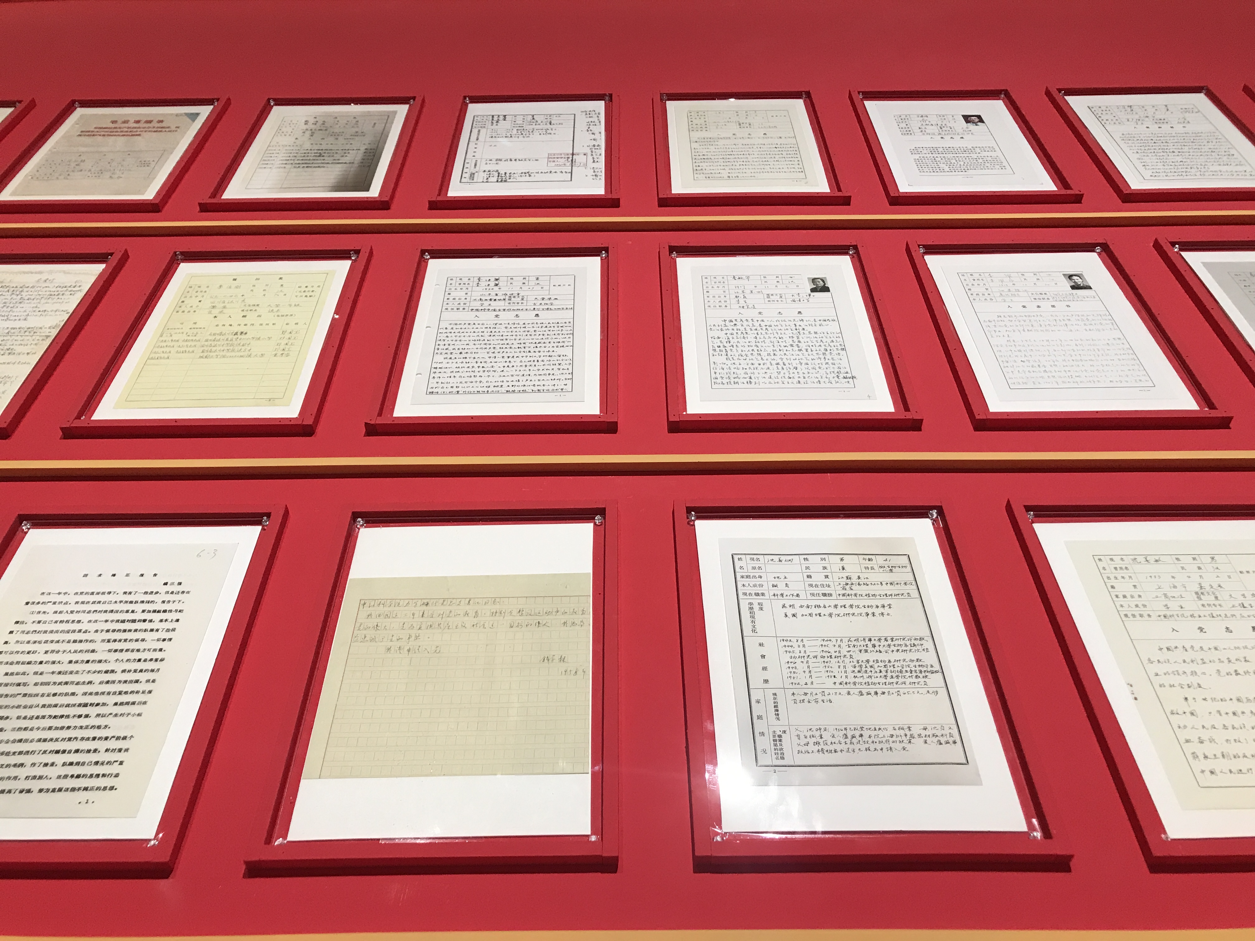 行至展区尽头,只见一面红墙上悬挂着100位科学家的入党申请书,纸张深浅不一,新旧不同;细细看来,每一篇笔迹都工整优美、话语质朴真切——