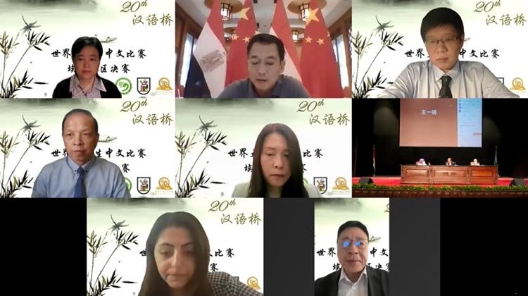 中国驻埃及大使馆教科处公参王胜刚、开罗大学副校长加马尔·埃尔沙利以及7位专家评委、媒体记者、埃及各大高校中文系师生代表、孔子学院师生代表、埃及汉语桥俱乐部代表等各界人士在线上观摩了比赛。