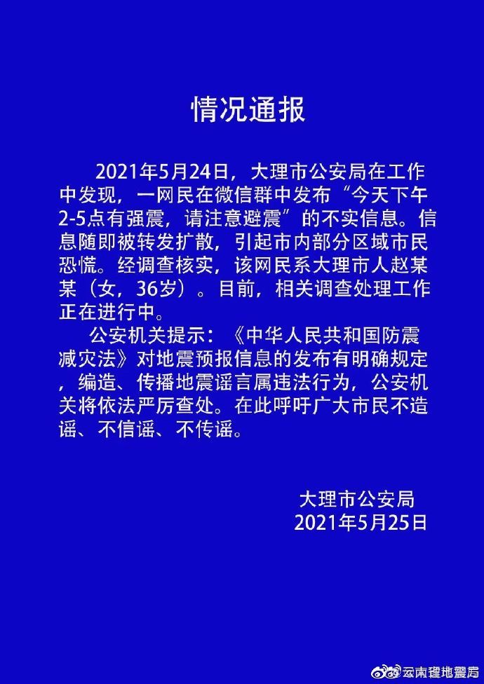 @大理发布 2021年5月24日,大理市公安局在工作中发现,一网民在微信群中发布“今天下午2-5点有强震,请注意避震”的不实信息。信息随即被转发扩散,引起市内部分区域市民恐慌。经调查核实,该网民系大理市人赵某某(女,36岁)。目前,相关调查处理工作正在进行中。需要提醒大家的是,只有政府有权发布地震预报,其他任何部门、单位或个人都无权发布地震预报。请大家不要听信谣言。