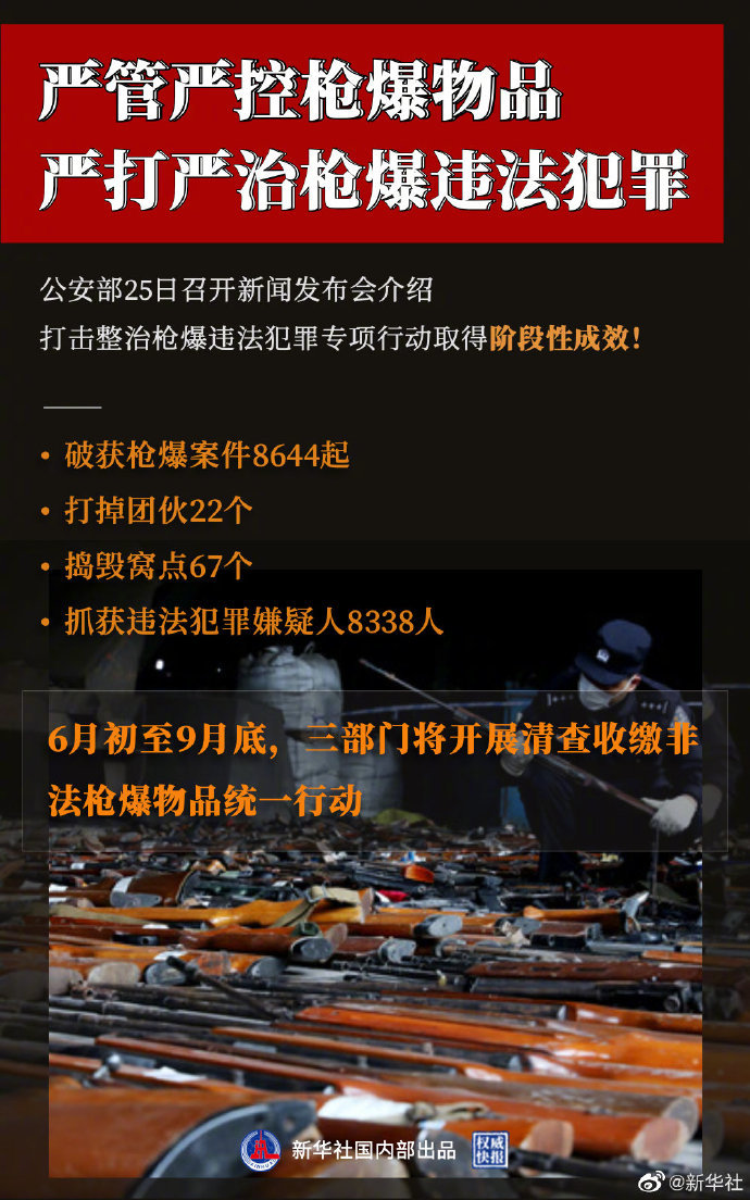 6月初至9月底,最高法、最高检、公安部将联合开展清查收缴非法枪爆物品统一行动,进一步挤压非法枪爆物品社会存量,全力推动打击整治专项行动深入开展。