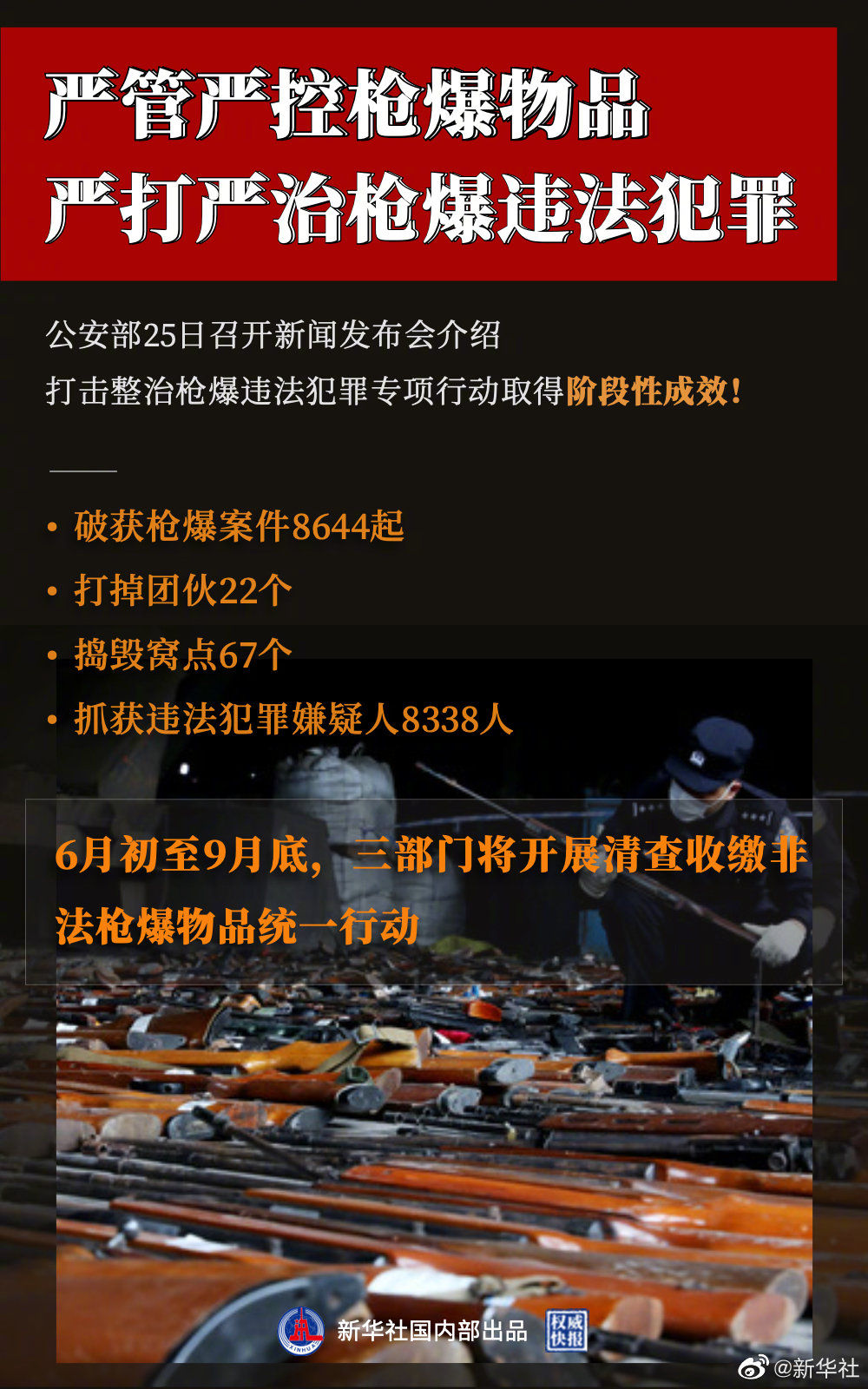 【权威快报 | 三部门部署开展清查收缴非法枪爆物品统一行动】6月初至9月底,最高法、最高检、公安部将联合开展清查收缴非法枪爆物品统一行动,进一步挤压非法枪爆物品社会存量,全力推动打击整治专项行动深入开展。公安部治安管理局局长李京生25日介绍,从近年来开展打击整治工作的实际情况看,通过专项行动破获枪爆案件8644起、打掉团伙22个、捣毁窝点67个、抓获违法犯罪嫌疑人8338人,收缴了大量非法枪爆物品,但仍有部分非法枪爆物品流散社会,给社会公共安全和人民生命、财产安全带来重大隐患。各地公安机关将广泛发动基层力量,全面排查整治易私制、私存枪爆等物品的重点地区、重点部位,全面收缴非法枪爆等危险物品,着力营造“人人远离、人人抵制、主动上缴”的良好氛围。(记者任沁沁、熊丰 海报设计肖循)