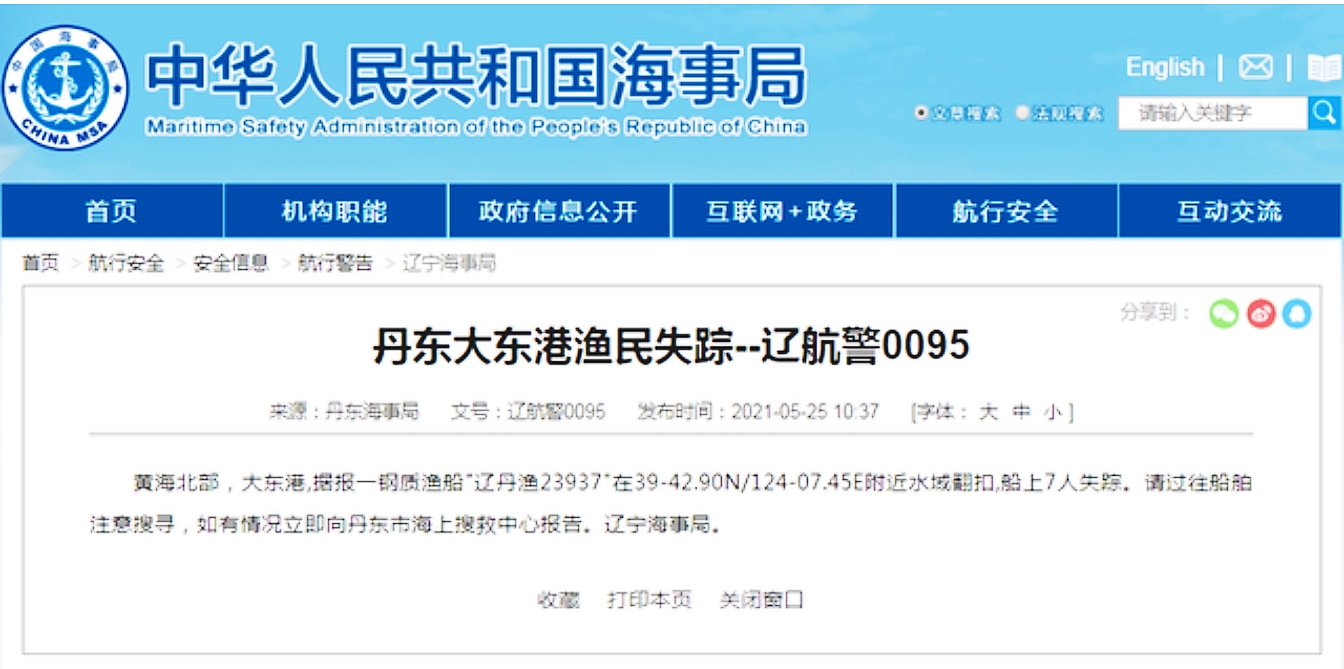 记者从辽宁海事局获悉,5月25日上午,在黄海北部丹东大东港,一钢质渔船"辽丹渔23937"在39-42.90N/124-07.45E附近水域翻扣,船上7人失踪。海事部门发出航行警告,请过往船舶注意搜寻,如有情况立即向丹东市海上搜救中心报告。(总台记者 季熠非)