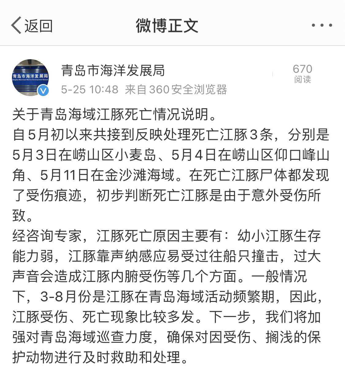 青岛海域连续发现死亡江豚,5月25日,青岛市海洋发展局通过其官方微博发布“关于青岛海域江豚死亡的情况说明”。