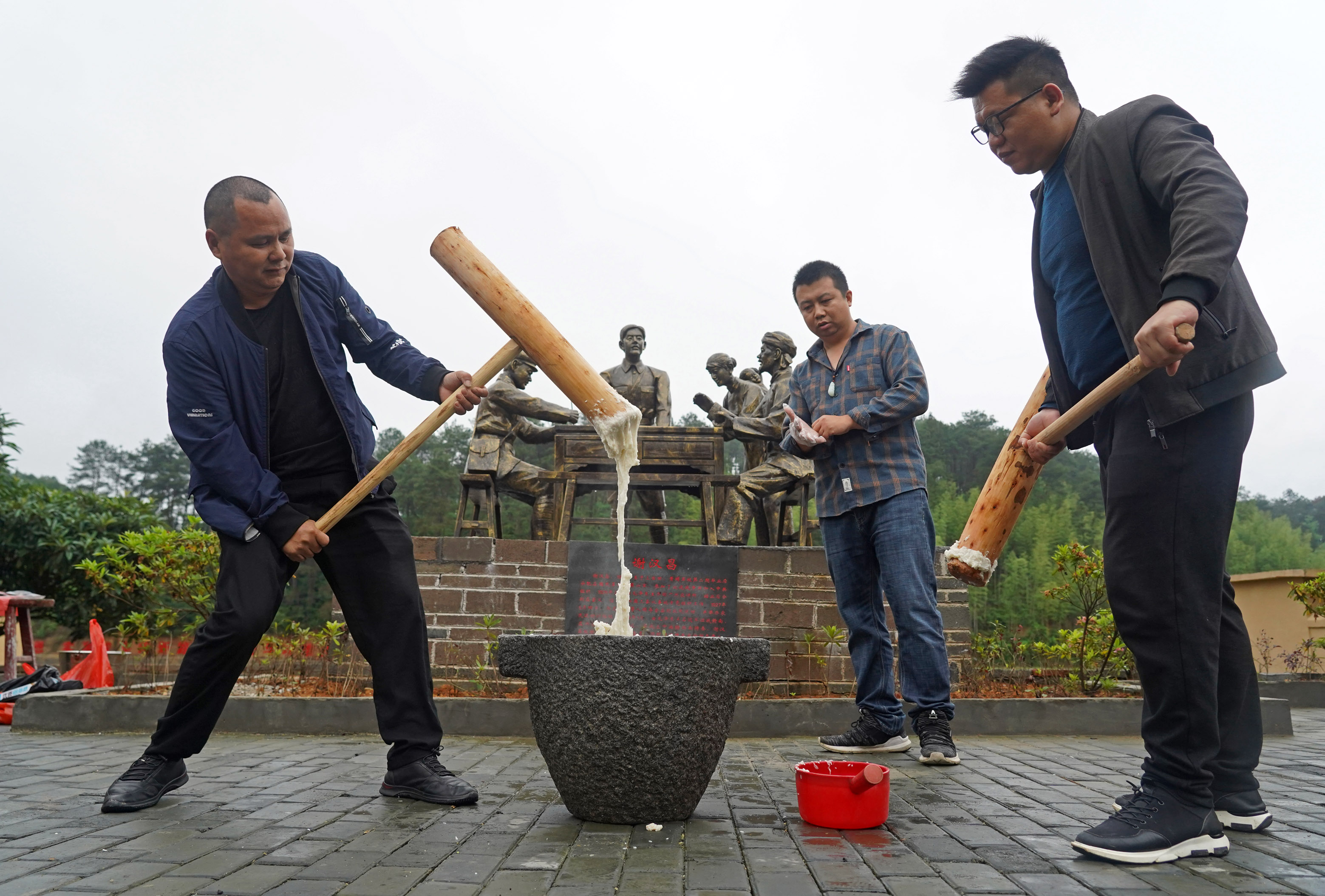 井冈山市的村民正在打糍粑招待游客。新华社记者 万象 摄