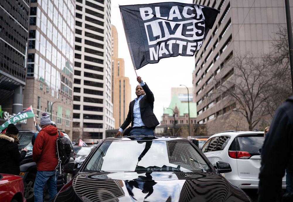 4月20日,得知肖万被控的谋杀和过失杀人等三项罪名全部成立后,民众手举“黑人的命也是命”标语的旗帜聚集在美国明尼阿波利斯市的法庭附近。新华社发(本·布鲁尔摄)