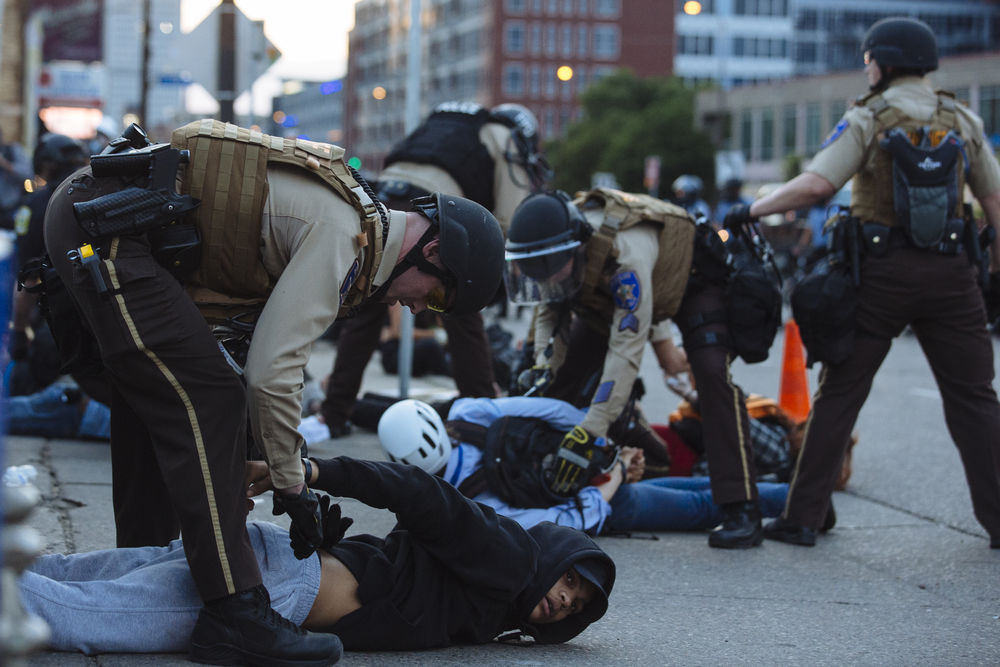 2020年5月31日,抗议示威者在美国明尼苏达州明尼阿波利斯市被警察逮捕。新华社发(安格斯·亚历山大摄)