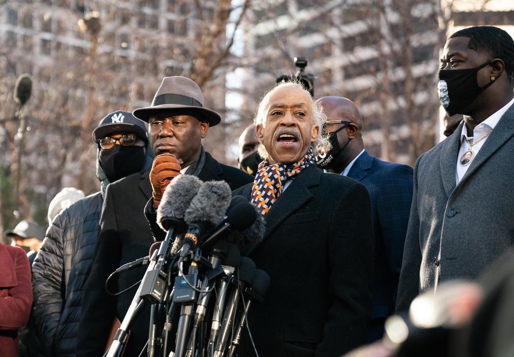 3月29日,美国民权运动领袖阿尔·沙普顿(前中)在位于美国明尼阿波利斯市的法庭外出席新闻发布会时讲话。新华社发(本·布鲁尔摄)