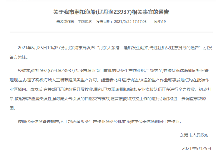 2021年5月25日10点37分,辽宁丹东海事局发布“丹东大东港一渔船发生翻扣,请过往船只注意搜寻的通告”,引发各方关注。