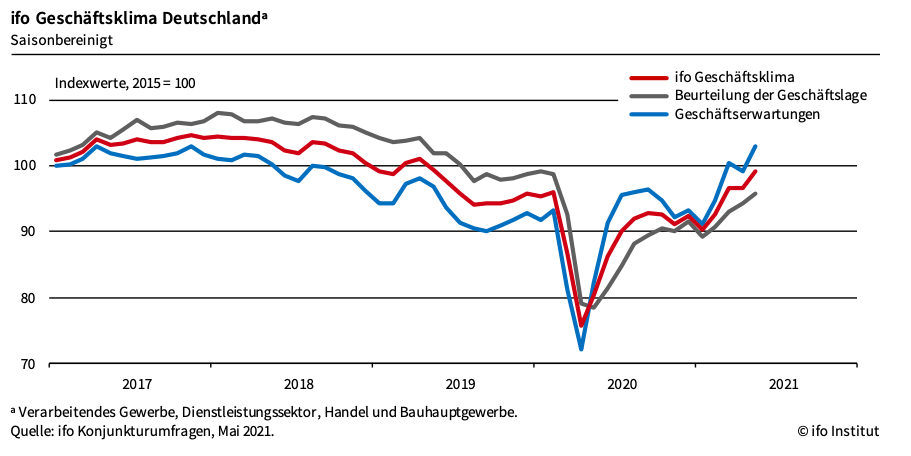 德国智库伊弗经济研究所当地时间25日公布的统计数据显示,德国5月的商业景气指数环比继续上升,从4月的96.6点大幅增长至99.2点,创下2019年5月以来的最高值。
