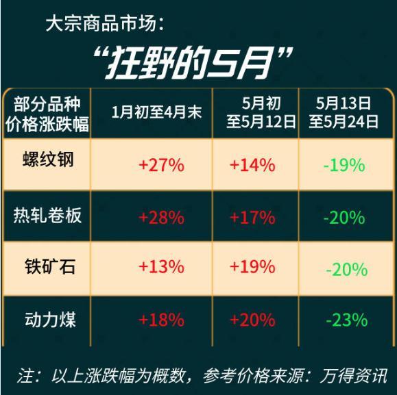 然而,5月12日之后,大宗商品快速“红翻绿”。用“我的钢铁”资讯总监徐向春的话说,“怎么涨上去的,又怎么跌回来了。”