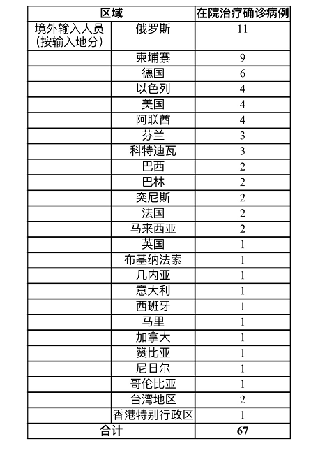 截至2021年5月25日24时,累计境外输入确诊病例1707例,出院1640例,在院治疗67例。现有待排查的疑似病例1例。