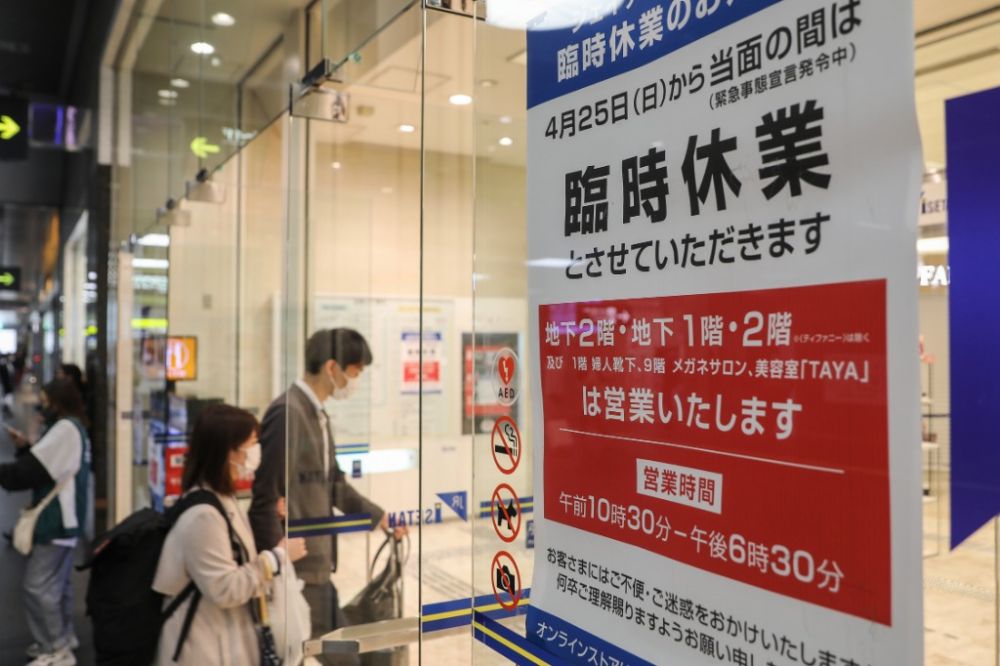 4月29日,在日本京都,一家百货店门前贴出告示,告知顾客大部分店铺暂停营业,仍营业的店铺缩短营业时间。(新华社记者杜潇逸摄)