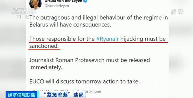 欧盟24日晚宣布,将采取必要措施禁止来自白俄罗斯的航班进入其领空,同时将禁止白俄罗斯的航班使用欧盟境内的机场。欧盟还呼吁所有欧盟所属的航空公司航班避免飞越白俄罗斯空域。欧盟方面当天还决定,将尽快对白俄罗斯及该国有关人员追加制裁。 当天,欧盟委员会主席冯德莱恩称这起事件为“劫机事件”,她在社交媒体发文称,“劫机事件”的始作俑者将受到制裁。