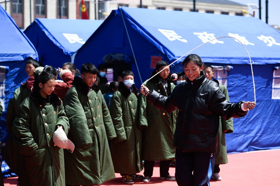 5月24日,曲迈卓玛在课间与同学们一起跳绳。新华社记者 张龙 摄