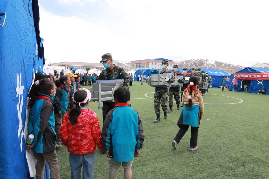 5月24日,武警青海总队果洛支队机动大队排长张国睿(前一)和战友为花石峡镇藏文中心寄宿制小学的帐篷教室搬运课桌。新华社记者刘芳摄