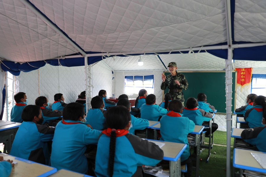 5月24日,武警青海总队果洛支队机动大队排长张国睿为花石峡镇藏文中心寄宿制小学的孩子上课。新华社记者刘新摄