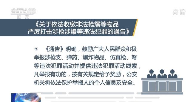 《通告》明确,鼓励广大人民群众积极举报涉枪支、弹药、爆炸物品、仿真枪、弩等违法犯罪活动并提供违法犯罪活动线索,凡举报有功的,按有关规定给予奖励,公安机关将依法保护举报人的个人信息及安全。