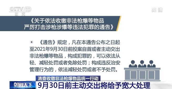 《通告》规定,凡在本公告公布之日起至2021年9月30日前投案自首或者主动交出非法枪爆等物品,构成犯罪的,可以依法从轻、减轻处罚,构成违法治安管理行为的,依法减轻处罚或者不予处罚。