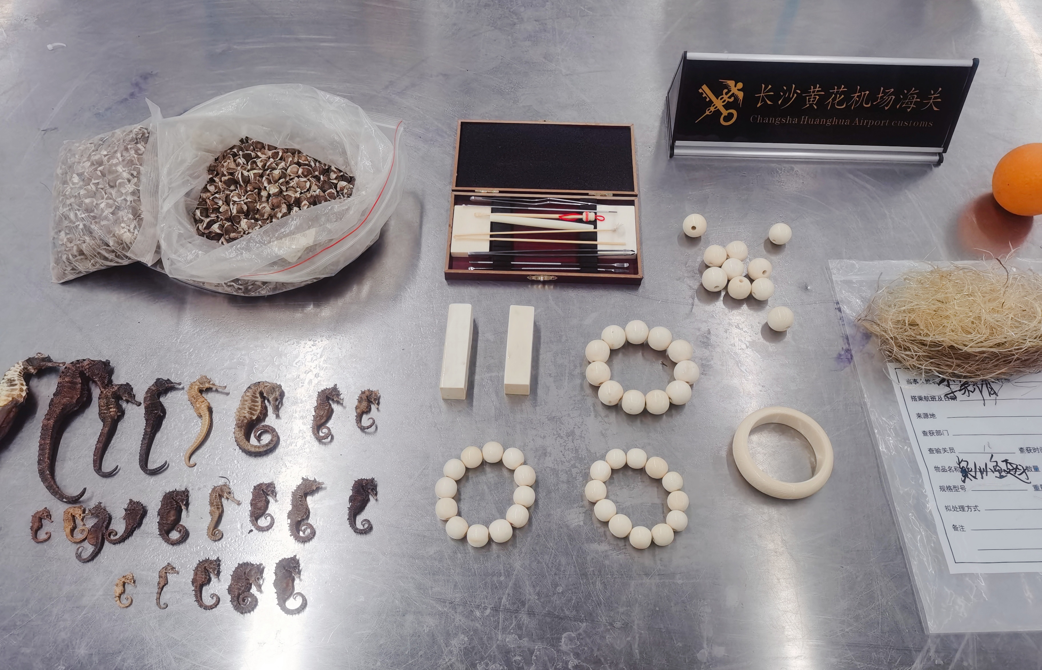 21日,长沙黄花机场海关旅检现场关员在对一入境航班进行监管时,发现一名进境旅客行李X光机图像存在异常。经开箱查验,发现多件疑似象牙制品,后经鉴定为象牙制品。同时,现场还查获干海马60克、鱼翅90克、辣木籽620克。目前,海关已依法对上述物品进行暂扣。