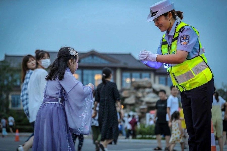 河南省修武县云台古镇旁,一名身着汉服的小女孩与现场执勤警察作揖问候。(修武县委宣传部 供图)