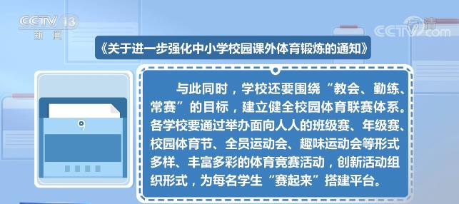 与此同时,学校还要围绕“教会、勤练、常赛”的目标,建立健全校园体育联赛体系。各学校要通过举办面向人人的班级赛、年级赛、校园体育节、全员运动会、趣味运动会等形式多样、丰富多彩的体育竞赛活动,创新活动组织形式,为每名学生“赛起来”搭建平台。