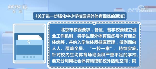 北京市教委要求,各区、各学校要建立健全工作机制,将学生课外体育锻炼与体育课总体统筹,并纳入学生体质健康管理,做到面向人人、覆盖全员、“一校一案”、持续实施。针对校内生均体育场地面积严重不足的学校,要充分利用社会体育场馆和校外活动空间;同时要根据学校体育活动的特点和规律,依据《北京市中小学幼儿园学生伤害事故处理办法》,规范校园体育安全管理,按规定投保校方责任保险,做到应保尽保,加强运动风险防范,做好遇雾霾、沙尘等极端天气工作预案。