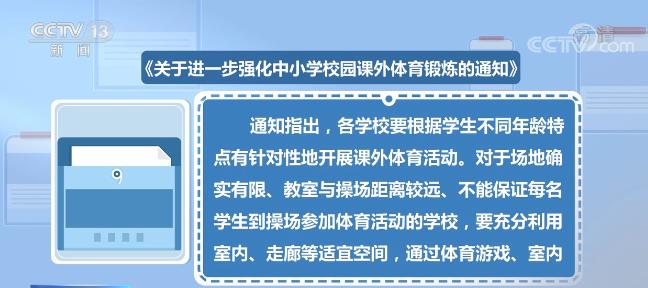 通知指出,各学校要根据学生不同年龄特点有针对性地开展课外体育活动。对于场地确实有限、教室与操场距离较远、不能保证每名学生到操场参加体育活动的学校,要充分利用室内、走廊等适宜空间,通过体育游戏、室内操等方式,丰富课外体育活动内容,增强体育活动的趣味性,确保所有学生都“动起来”,享受体育活动带来的乐趣。