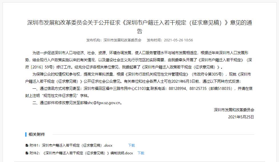 5月25日,深圳市发展和改革委员会公开征求《深圳市户籍迁入若干规定(征求意见稿)》意见(以下简称《征求意见稿》)。此次《征求意见稿》有诸多收紧的变化,将核准类学历型人才的底线要求调整为全日制本科,这意味着全日制大专学位将无法直接入户了,技术型人才底线要求调整为“中级职称+全日制大专”,技能型人才的底线要求调整为技师;本科收紧到35岁,硕士收紧到45岁。夫妻投靠基本要求由结婚时间及被投靠人入深户时间满2年调整为满5年,并增加高层次人才、高级职称、高级技师和硕士以上学历人员,原则上只享受一次不受时间限制优先解决配偶随迁问题的条件;老人随迁将子女入深户时间要求由8年调整为15年,并增加子女在深圳缴纳社保连续满15年的要求;对存在隐瞒、欺骗或提供虚假材料的入户人员,将2年内不得再次申请入户的政策要求提高至5年。