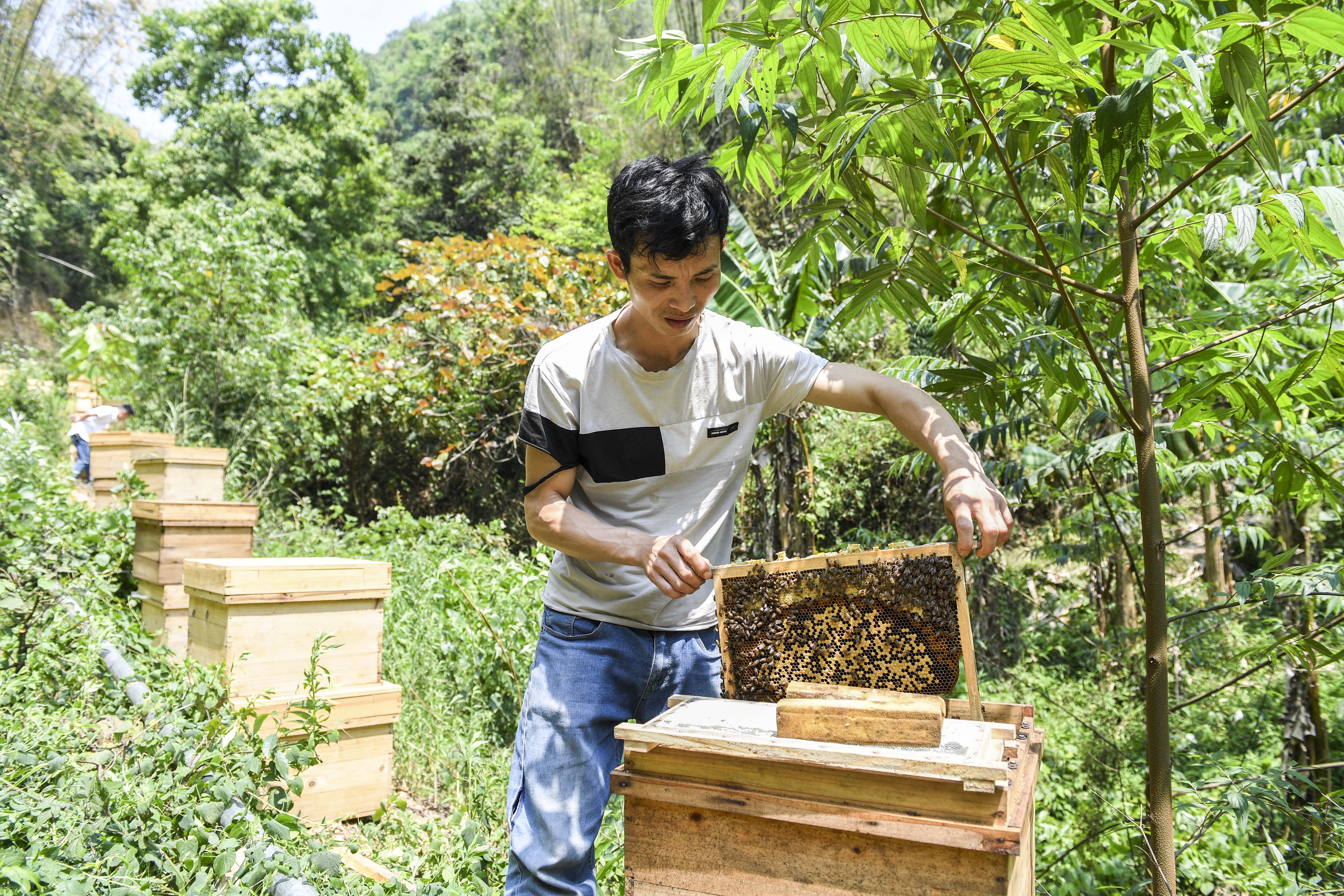 广西乐业县新化镇百坭村村民班华六在查看蜂巢(2020年4月20日摄)。新华社记者曹祎铭摄