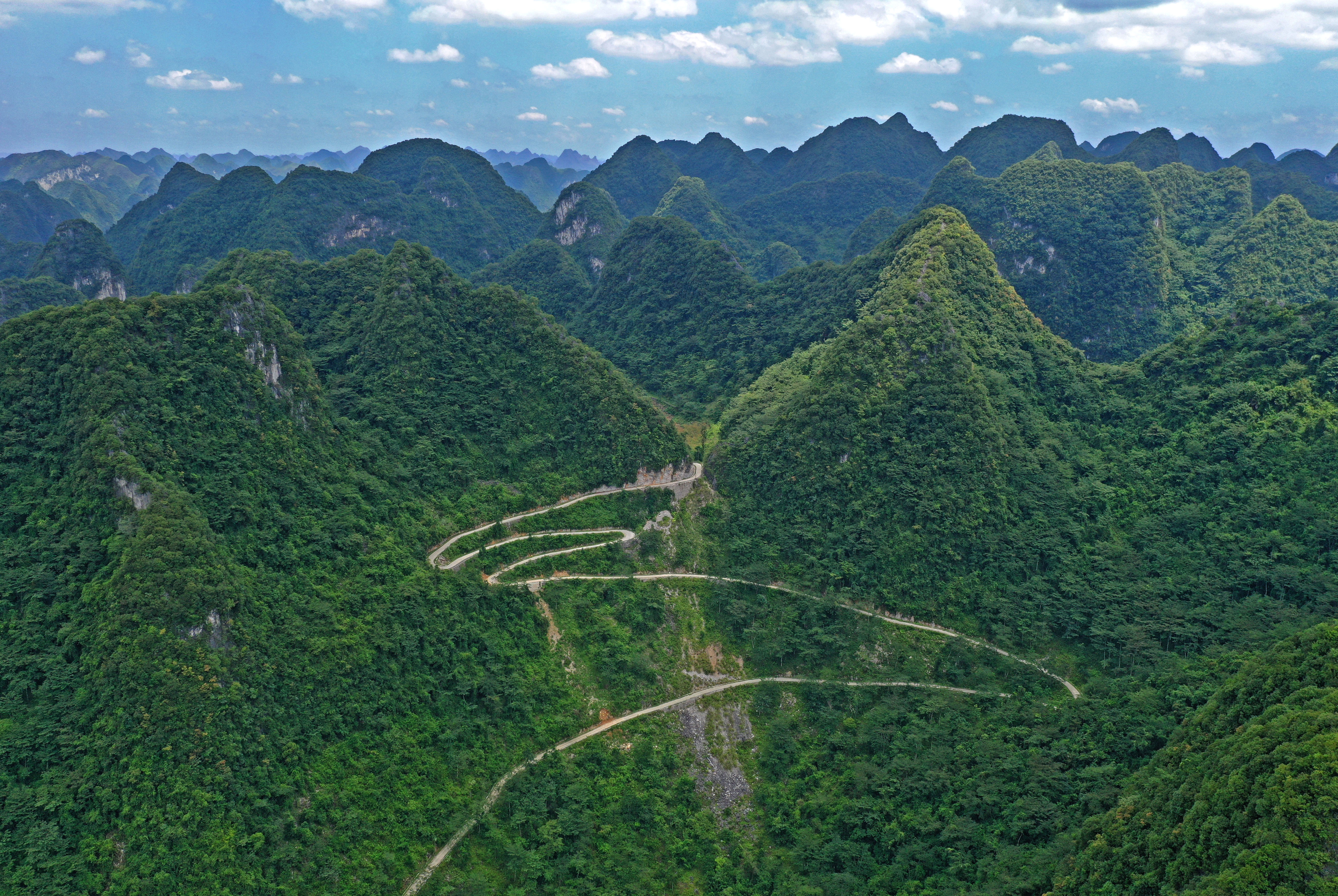 盘山公路穿越漫山翠绿的广西都安瑶族自治县三只羊乡鸡峒村(无人机照片,2020年7月23日摄)。新华社记者周华摄