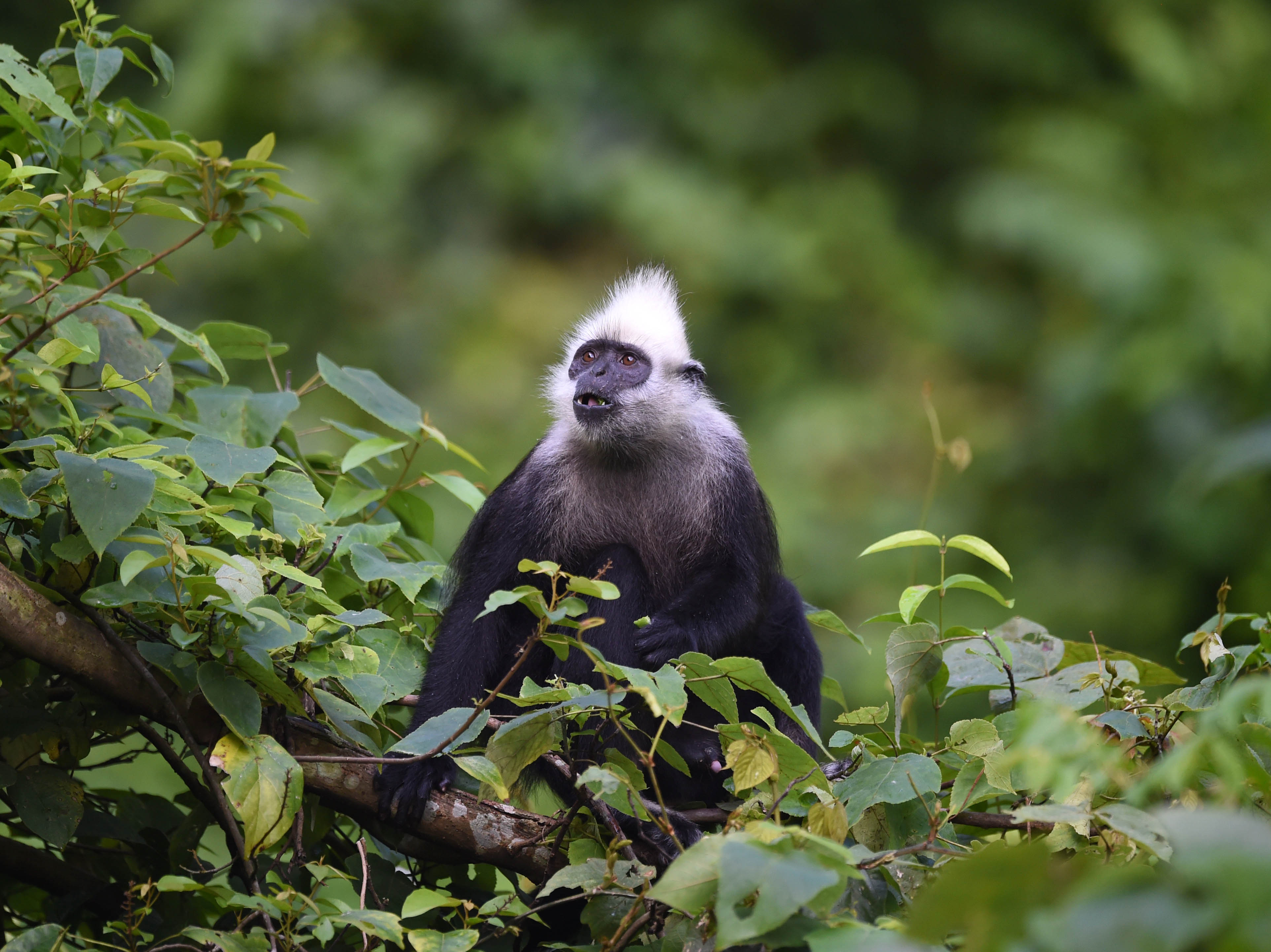 广西崇左白头叶猴国家级自然保护区板利片区一处山坳里,在族群觅食的时候,猴王警惕地观察周围环境(2016年8月6日摄)。新华社记者周华摄