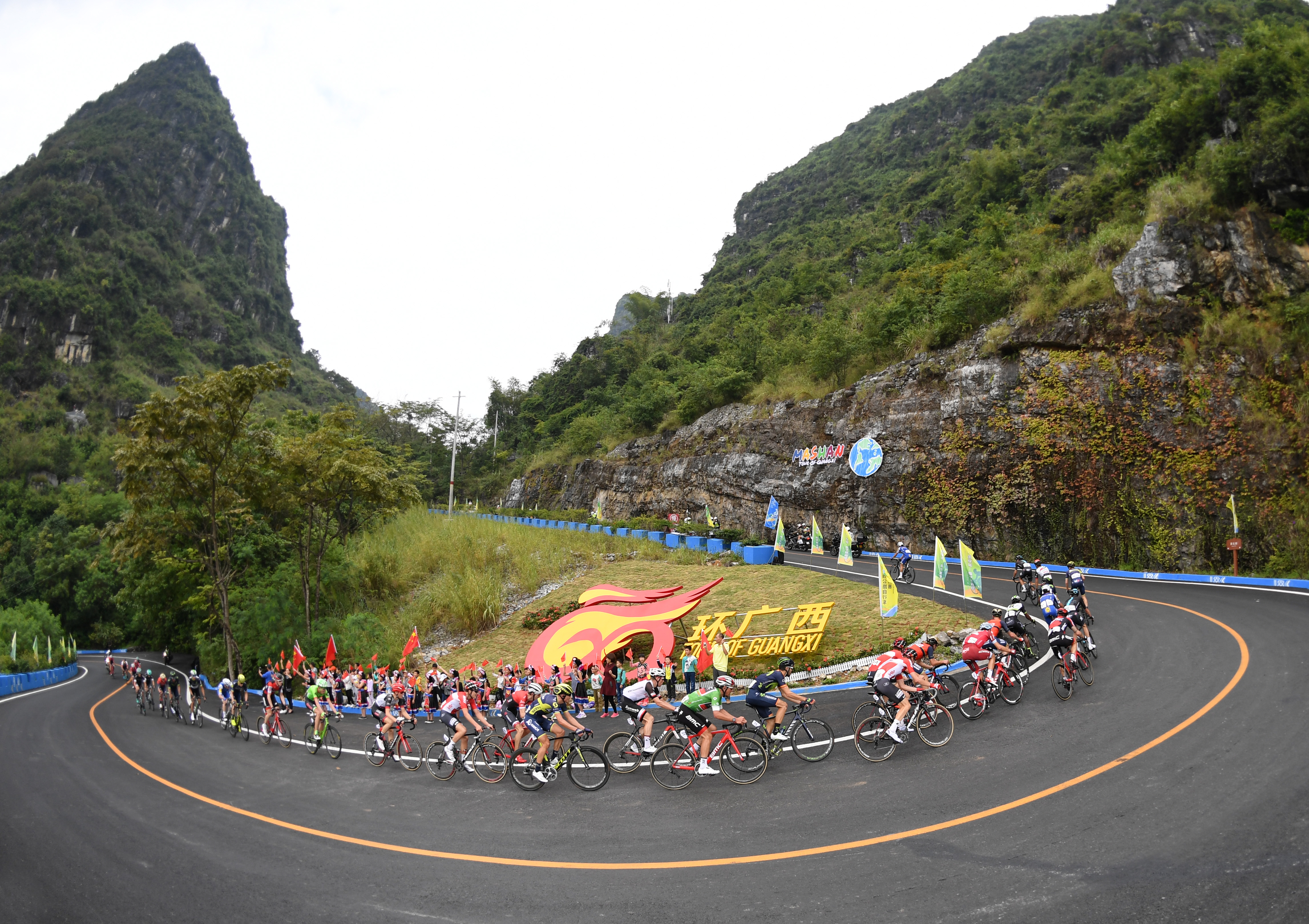 在环广西公路自行车世界巡回赛中,参赛选手经过马山县古零镇古零村弄拉屯路段(2017年10月22日摄)。新华社记者陆波岸摄
