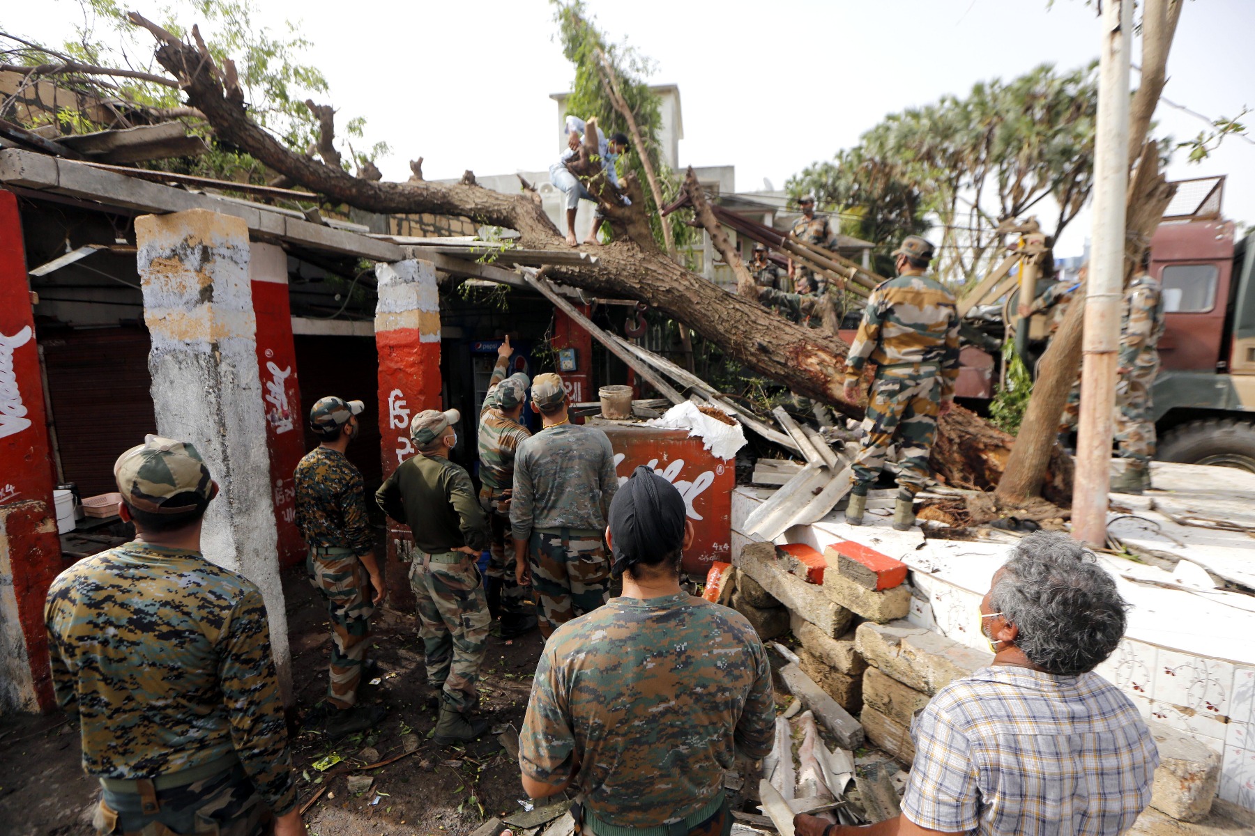 5月19日,印度军人在第乌查看被热带气旋“陶克泰”损毁的场所。(新华社发)