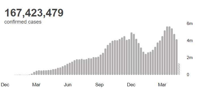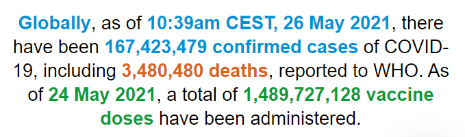 根据世卫组织最新实时统计数据,截至欧洲中部夏令时间5月26日10时39分(北京时间5月26日16时39分),全球累计新冠肺炎确诊病例167423479例,累计死亡病例3480480例。(总台记者 朱赫)