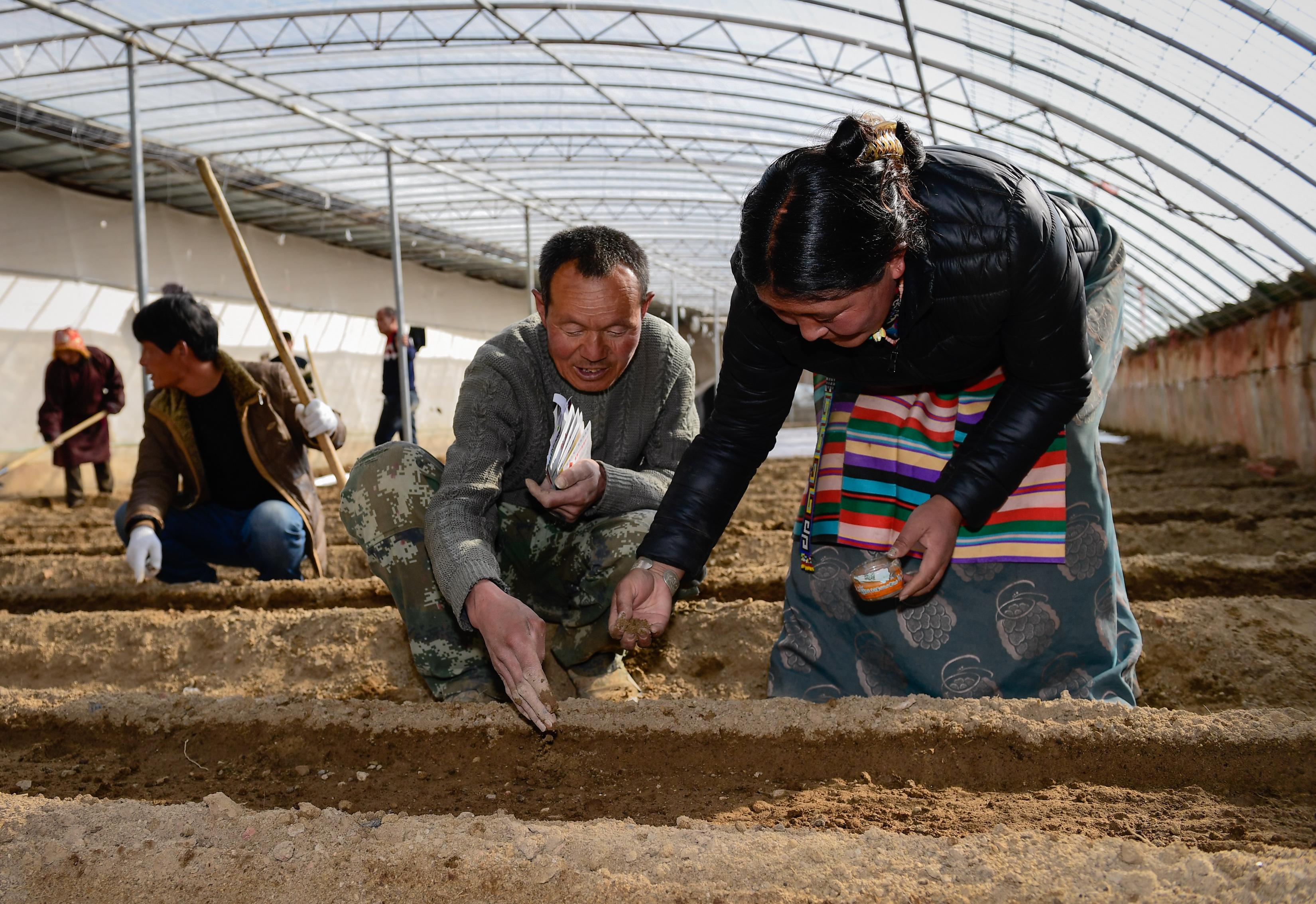2018年3月13日,西藏阿里地区噶尔县生态农业产业园农技人员杨茂录(右二)在园区大棚中为当地贫困户石确桑嘎(右)传授瓜果种植技术。新华社记者刘东君 摄