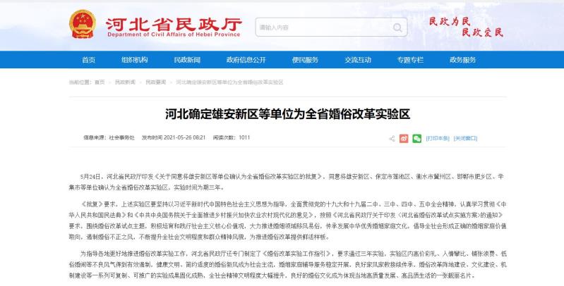 日前,河北省民政厅印发《关于同意将雄安新区等单位确认为全省婚俗改革实验区的批复》,同意将雄安新区、保定市莲池区、衡水市冀州区、邯郸市肥乡区、辛集市等单位确认为全省婚俗改革实验区,实验时间为期3年。