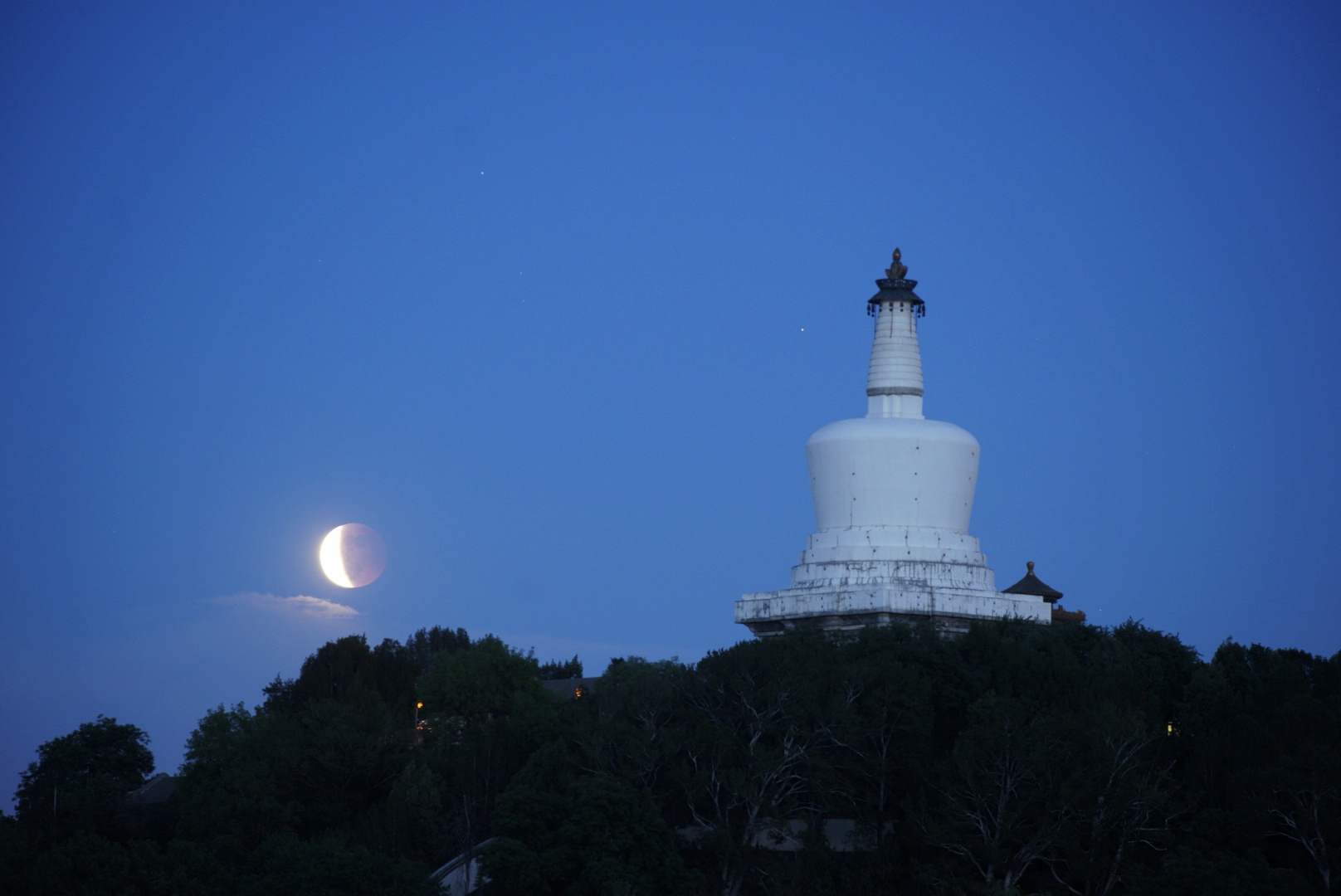 ↑北京市天文爱好者郑志5月26日晚在北海公园拍摄的“超级月全食”照片。(郑志本人供图)