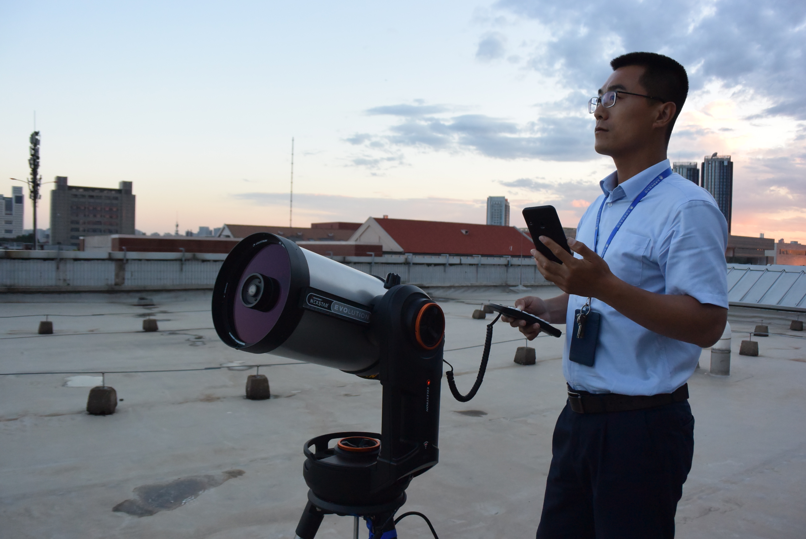 为了观测这一天文奇景,王俊峰提前就选好了西直门附近的一处高楼进行观测。“今天下午一场阵雨把天空洗得湛蓝,大气通透性非常好,非常适合观测。”王俊峰说。