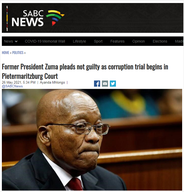 据南非国家广播公司当地时间5月26日报道,南非前总统祖马当日在该国夸祖鲁纳塔尔省彼得马里茨堡法院出庭受审。南非国家检察机关指控祖马及法国武器制造商泰雷兹(Thales)在1990年的武器交易案中涉嫌腐败,诈骗和洗钱。