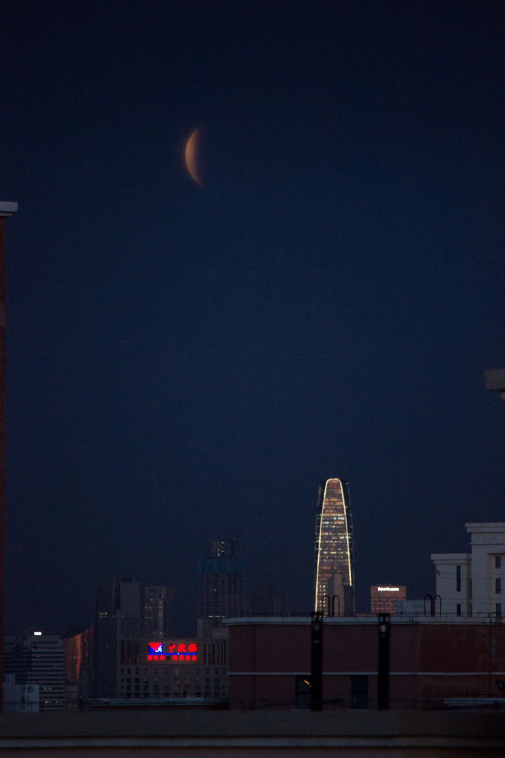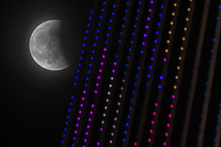 “因天气、月亮地平高度过低等原因,公众未能目睹到‘红月亮’,但生光后,一轮珠圆玉润的‘超级月亮’也给了观测者们些许安慰。”天津科技馆天文科普专家宋媛媛说。
