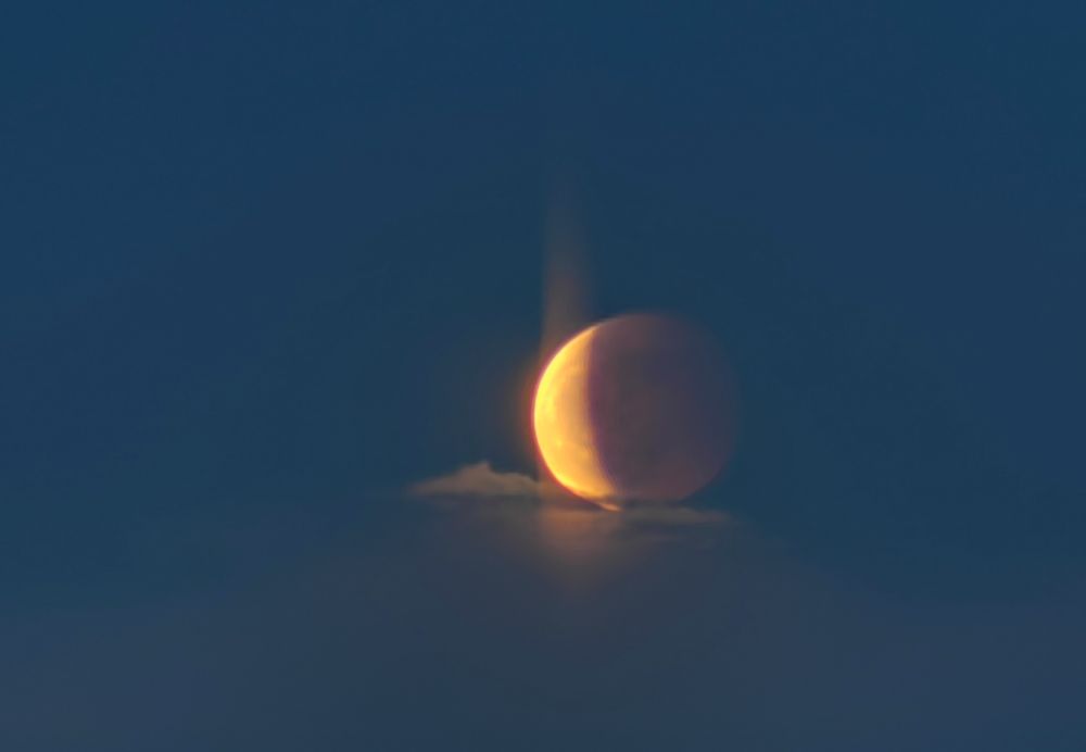 “天津的月出时间是19时22分,刚好是‘红月亮’阶段,但月亮此时刚升出地平线,再加上有云层干扰,没能看到全食阶段,只看到了一定程度的月偏食。‘超级月亮’少了一角,真的就像被‘天狗咬掉一小块’,也是很难得的画面。”马强说。