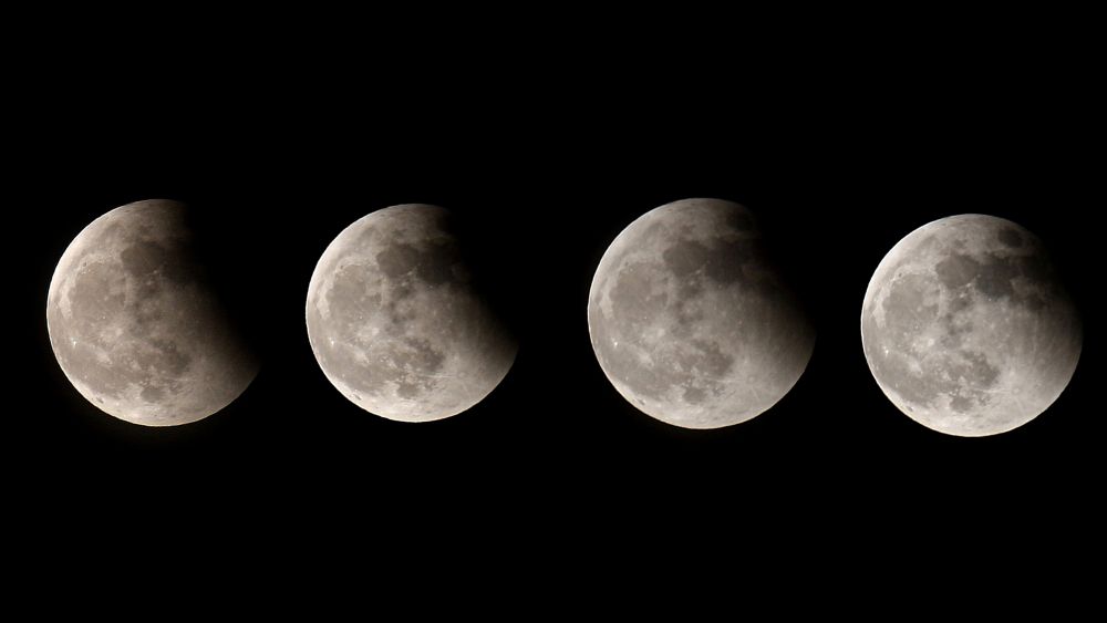 ↑这是山西省天文爱好者薛俊5月26日晚在运城市拍摄的“超级月全食”特写照片(拼图)。(薛俊本人供图)